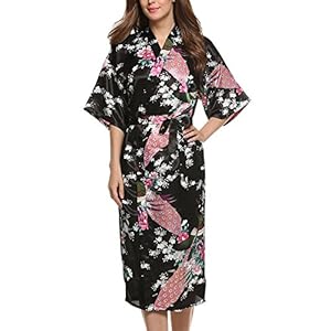 Dolamen Women’s Dressing Kimono Gown, Silk Satin Peacock and Blossoms Robe Bathrobe Bridesmaid Nightwear Pyjamas, Long…