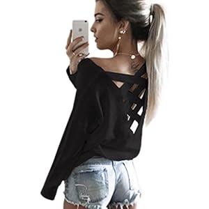 Measoul Women Cut Out Loose Pullover Deep V Back Criss Cross Top Tee Blouse